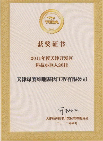 我公司獲得2011年度天津開發(fā)區(qū)科技小巨人20佳企業(yè)稱號