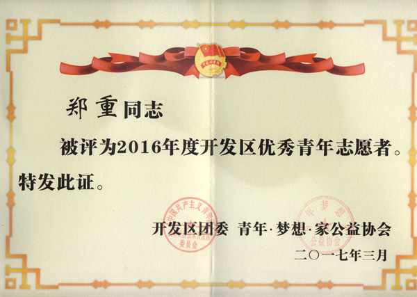 2016年,在開發(fā)區(qū)工委、管委會的正確領(lǐng)導(dǎo)下,開發(fā)區(qū)各級團組織和廣大青年志愿者開拓創(chuàng)新、積極進取, 在全社會大力普及志愿服務(wù)理念, 弘揚志愿服務(wù)精神, 引導(dǎo)和團結(jié)廣大青年在陽光助殘、扶貧濟困、青少年自護等方面開展了內(nèi)容豐富、形式多樣的志愿服務(wù)活動,青年志愿服務(wù)工作已成為引領(lǐng)社會風(fēng)氣之先的青春旗幟和推動開發(fā)區(qū)精神文明建設(shè)的重要力量,在建設(shè)和譜泰達的進程中發(fā)揮者不可替代的推動作用 。